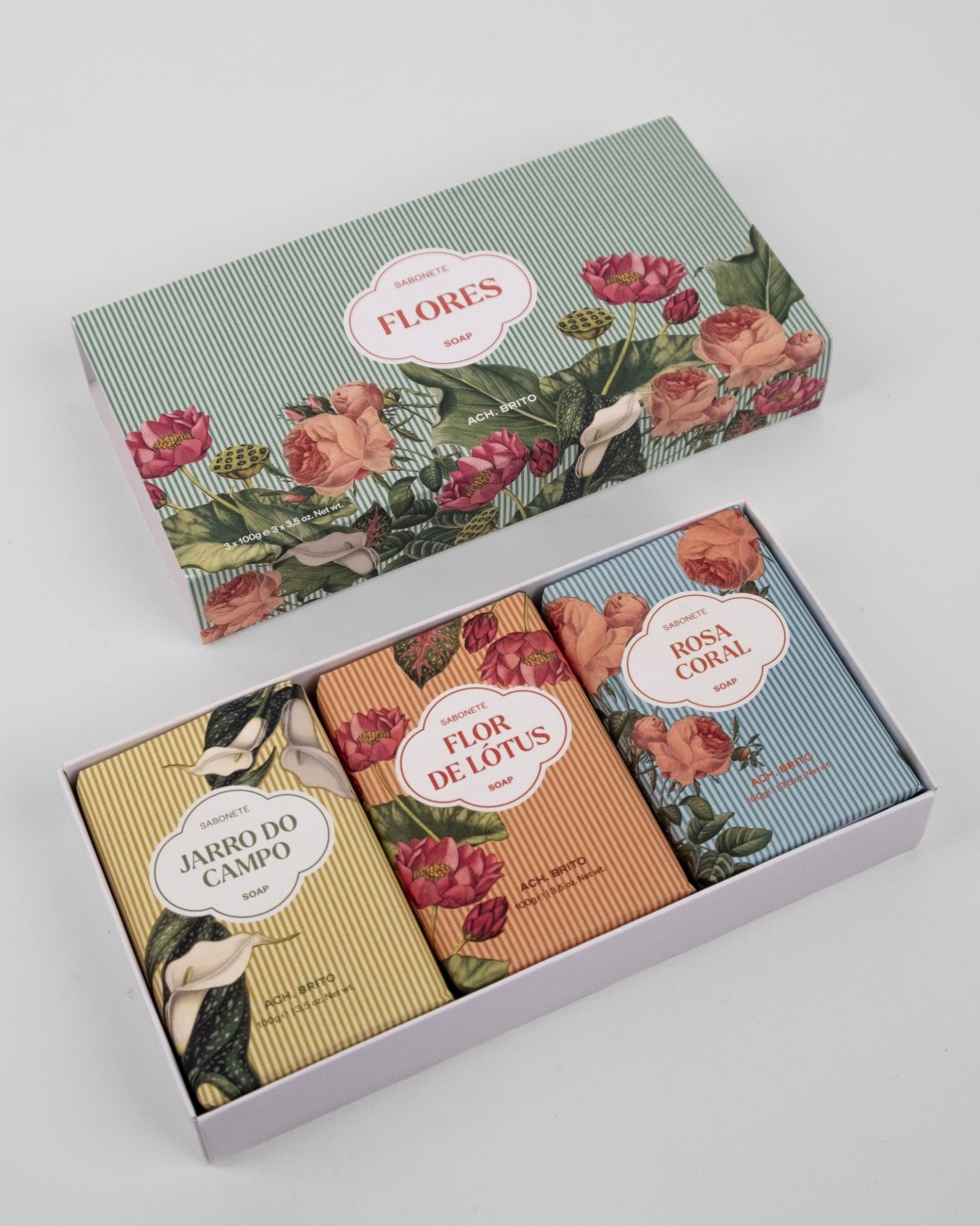 Inspirada nos antigos rótulos que marcaram a história da marca, a Caixa Flores apresenta-se com um charme retro que desperta memórias e celebra a autenticidade. No seu interior, encontrará três sabonetes hidratantes de fragrâncias delicadas e sofisticadas: Hortênsia Azul, Jarro do Campo e Flor de Lótus.Cada sabonete é cuidadosamente formulado com uma base de sabão 100% vegetal e enriquecido com óleo de amêndoas doces.Se procura um presente requintado ou um mimo para si, a Caixa Flores é uma escolha perfeita, que alia tradição, qualidade e beleza numa só peça.