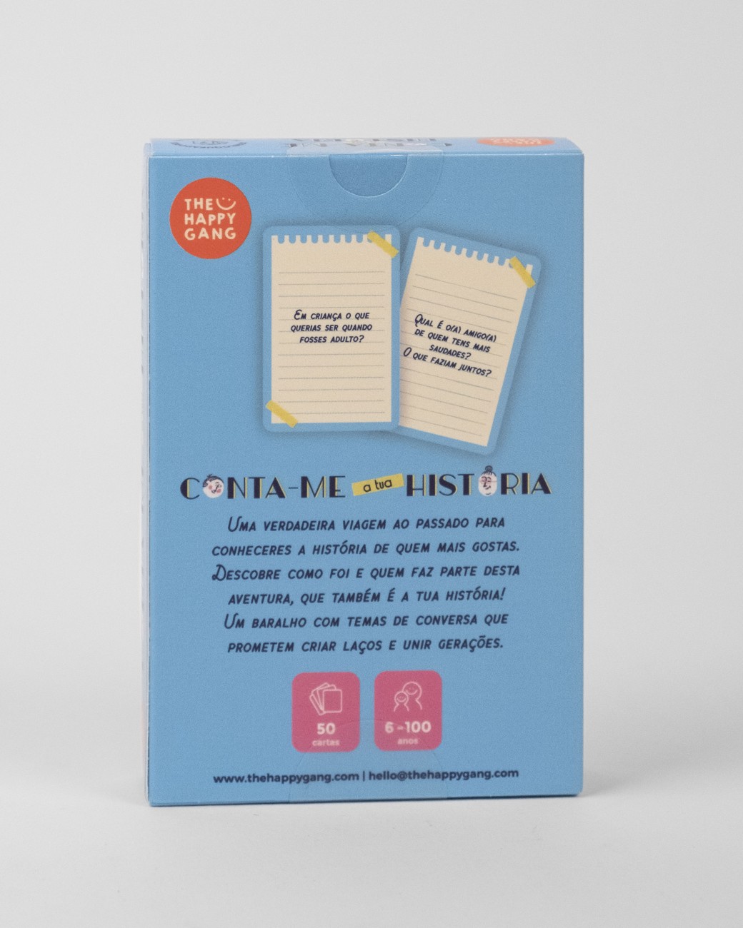 "Conta-me a Tua História" da The Happy Gang, um jogo de cartas com 50 perguntas para explorar as memórias dos teus avós. Descobre histórias fascinantes e cria laços entre gerações ao aprender mais sobre o passado da tua família. Perfeito para crianças a partir dos 5 anos este jogo foi ilustrado pela Bavaroise e pertence à nossa Gama de "Desbloqueadores de Conversa".